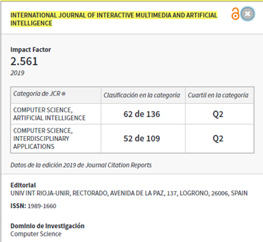 A celebratory moment: The International Journal of Interactive Multimedia and Artificial Intelligence (IJIMAI) is indexed by Clarivate, at JCR-SCI, with an initial impact factor of 2.561 (2019), under category Computer Science. A really nice achievement after 11 years of intensive and thorough work. My personal congratulations to the team, smartly led by Dr. Rubén González, at Universidad Internacional de La Rioja (UNIR). This journal, full open access with no Article Processing Charge (APC), becomes a reference on the topic. Let us take our 15′ of joy! More info @UNIRiTED